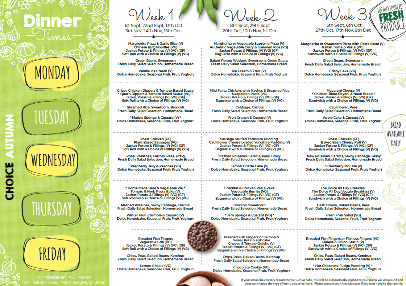 Parents need to log into School Grid to pre-order dinners. You can pre-order up to a whole term in advance! There are 4 choices every day. You can pre-order up to 9am each morning. If you do not pre-order, your child can choose in class in the morning.